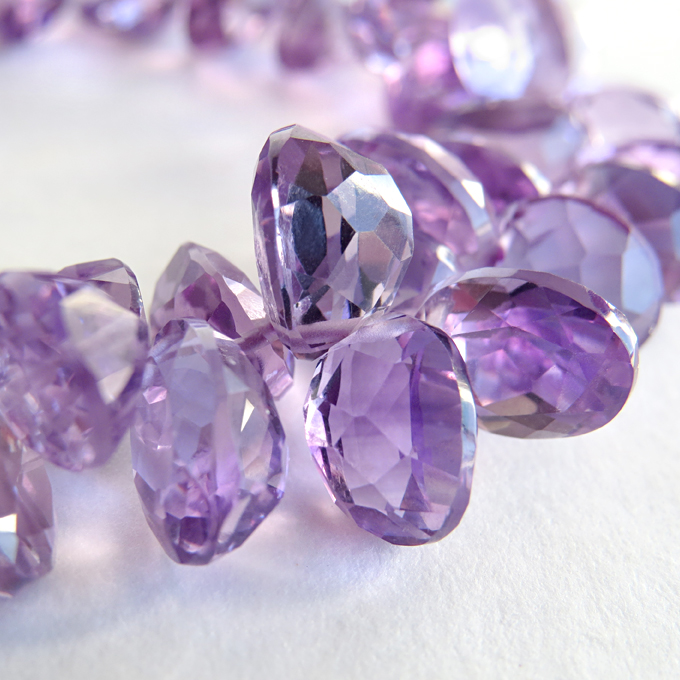 アメジストのブレスレット 家庭運/事業運/理解力/生命力/魔除け アメジスト(紫水晶) は、恋愛・家族関係を良好にし、精神安定・ストレス軽減など健康面にも効果があるとされています。財運・事業運アップにも◎。 こちらの商品は透明度が高く、カット面がキラキラ輝く華やかな藤色です。 |
